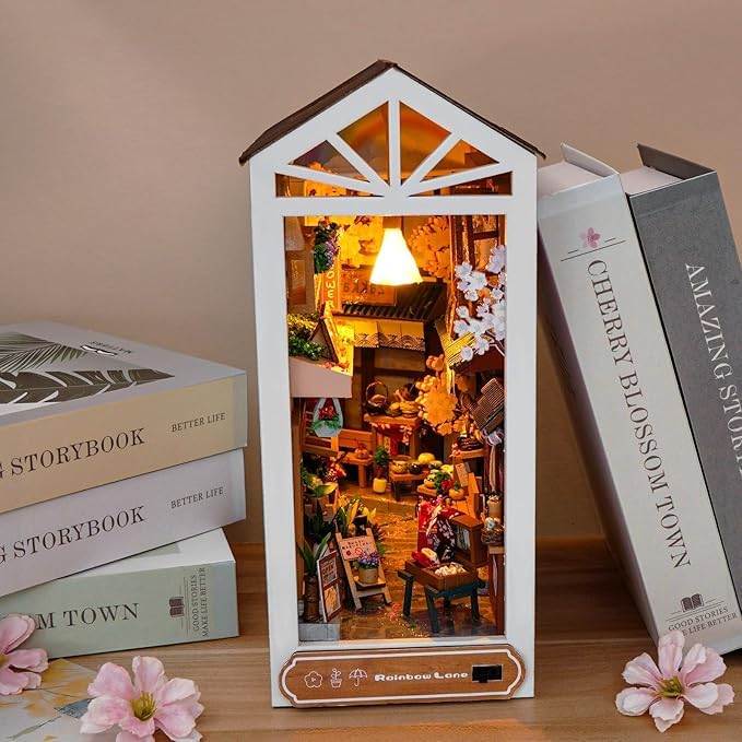 "Rainbow Lane" es un Book Nook DIY que captura el encanto de una vecindad tradicional japonesa decorada con sakuras, pequeñas tiendas y hogares acogedores, una experiencia llena de calma y belleza que se vuelve aún más especial cuando la construyes tú mismo.